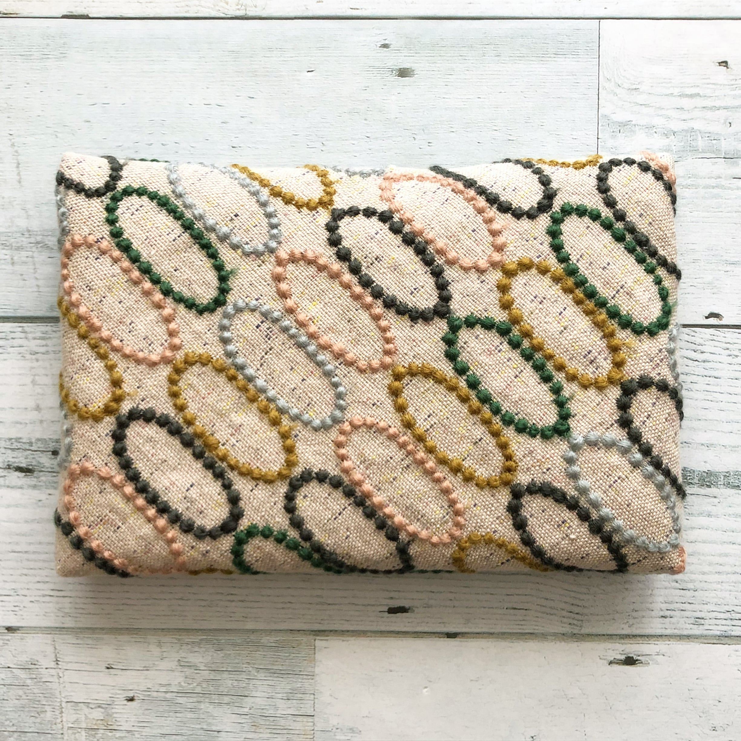 "tarte"は、タルトのようなフォルムの刺繍が並んだデザインです。生地のたて糸とよこ糸の色の違いなど、表情豊かな風合いをお楽しみください。