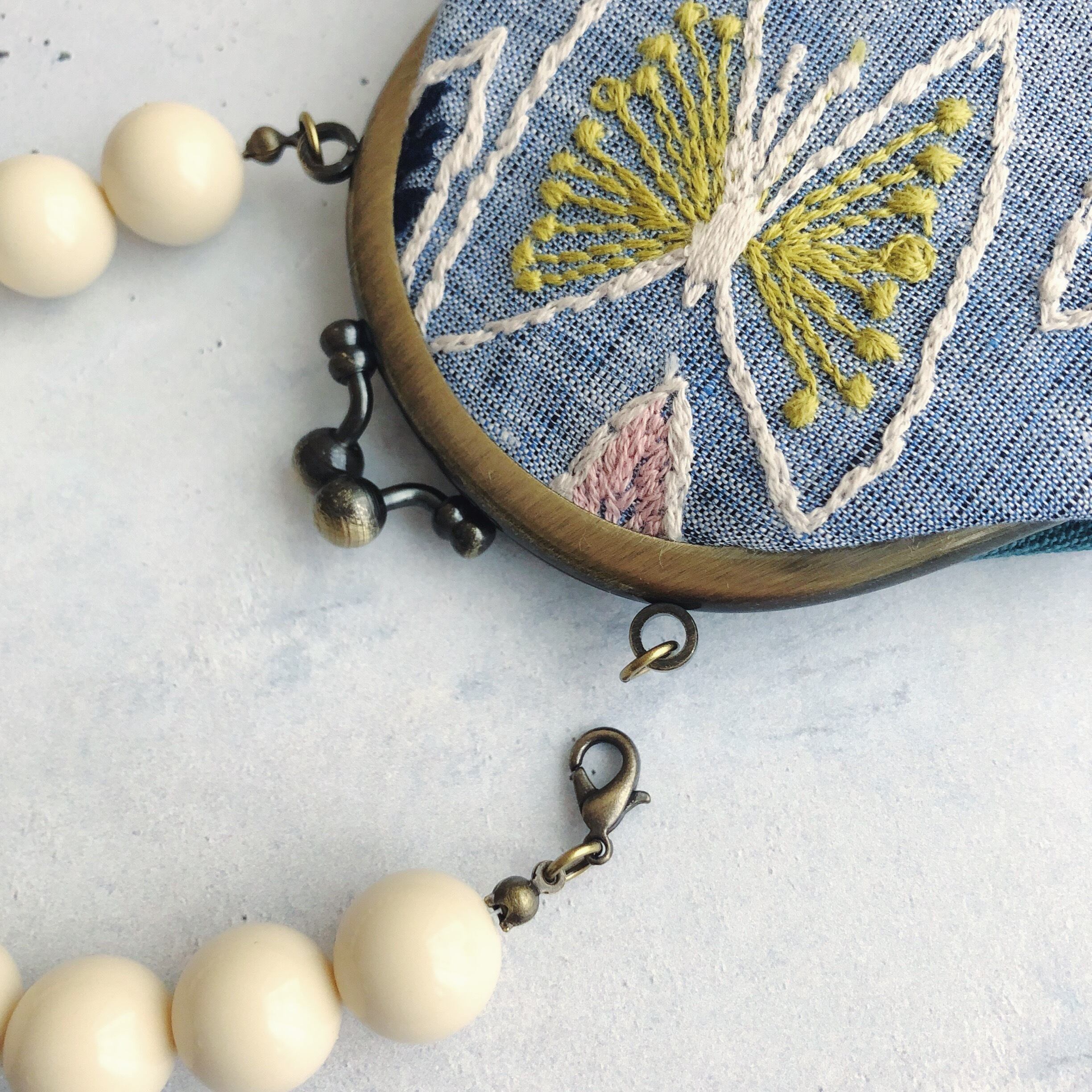 刺繍生地は、空一面を彩る花のように、様々な羽模様の蝶たちが舞う様子が表現された『sky flower (ミナペルホネン )』。